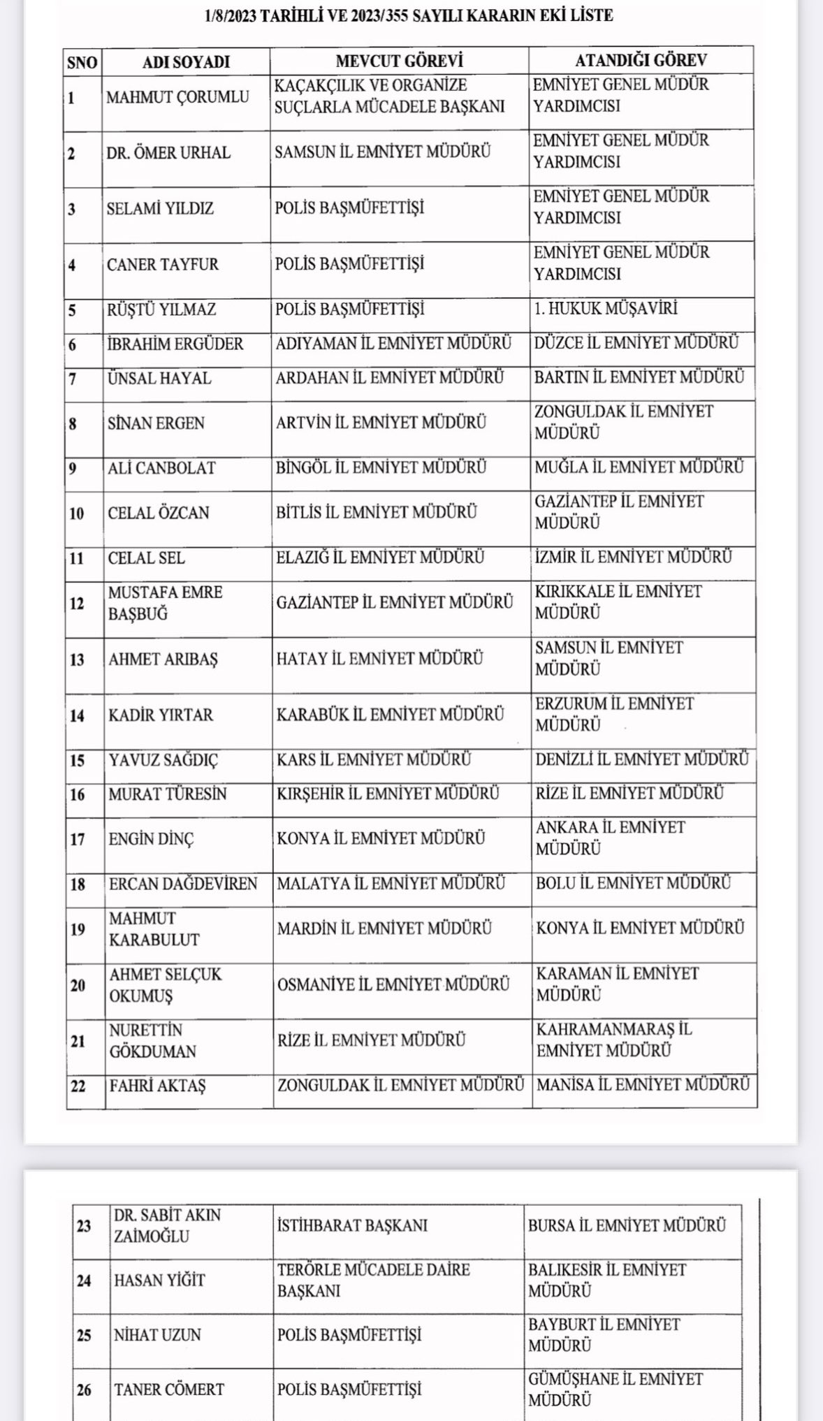Cumhurbaşkanı Erdoğan'ın imzasıyla Resmi Gazete'de yayımlanan emniyet müdürleri kararnamesindeki isimler ve görev yerlerinin tam listesi şöyle: