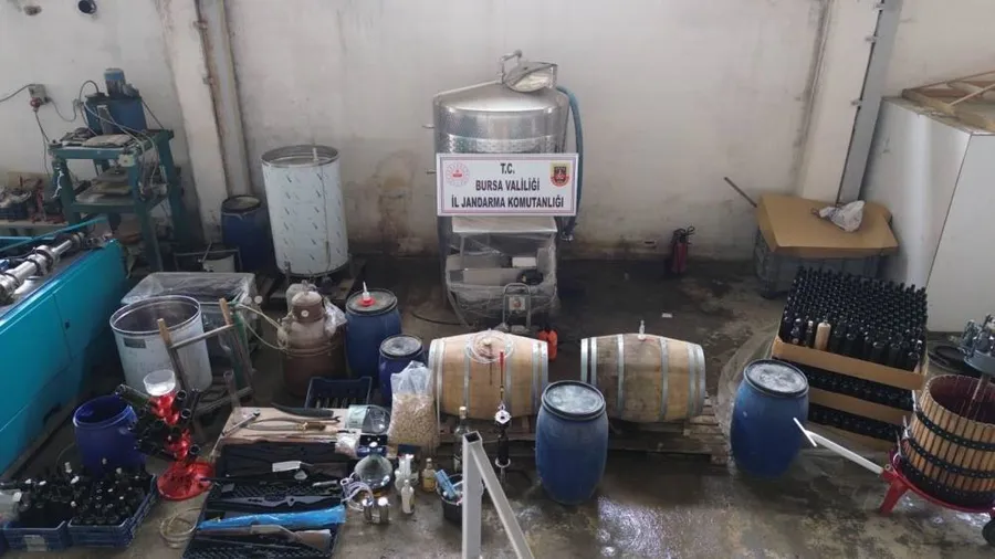 Edinilen bilgiye göre, Bursa’nın İznik İlçesi’nde bir şahsa ait iş yerinde polis ekipleri baskın yaptı. Yapılan aramada 800 litre el yapımı şarap, 5 litre şişelenmiş ve bandrolsüz şarap, 500 kilogram şarap yapımında kullanılan üzüm posası ile 500 gram alkol aroma kiti, 1 adet üzüm sıkma makinesi, 1 adet üzüm eleme makinesi, 1 adet alkol şişeleme makinesi, 2 adet damıtma ve bekletme kazanı, 5 adet alkolmetre, 750 adet boş şarap şişesi, bin adet şarap tıpası ve üzerinde herhangi bir ibare bulunmayan 50 adet alkol şişesi ile 3 kılıç ele geçirildi.