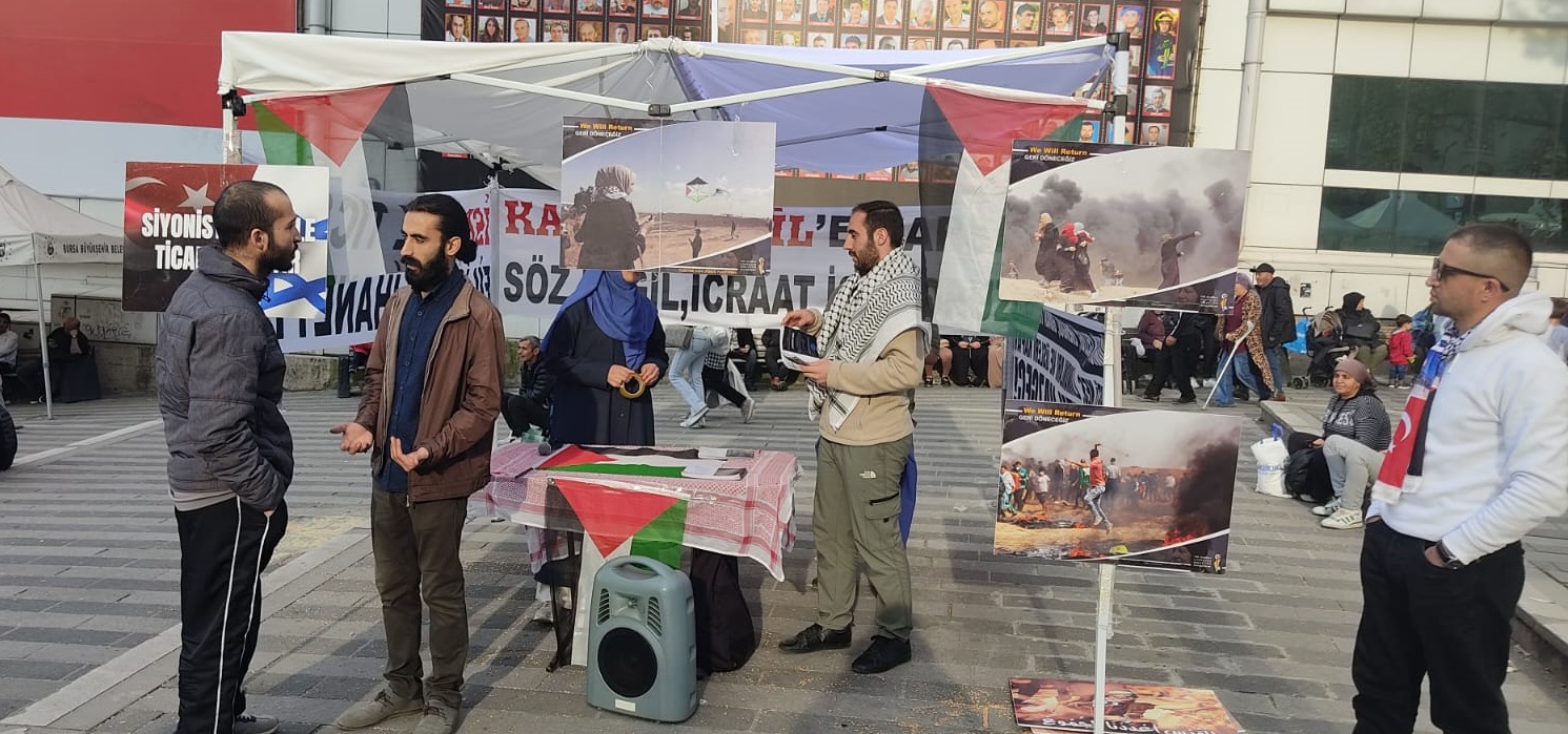 Bursa’nın en işlek aksı olan Osmangazi İlçesi’ndeki Şehreküstü Meydanı’ndaki çadırın etrafına asılan pankartlarda, ‘Siyonist’in çeliği, enerjisi Türkiye’den. Ticareti kes, limanları ve üsleri kapat. İhanetten vazgeç” şeklinde ifadelere yer verilirken, bir başka pankartta ise, İsrail’le Ticaret, Filistin’e ihanettir” sözleri dikkat çekti.
