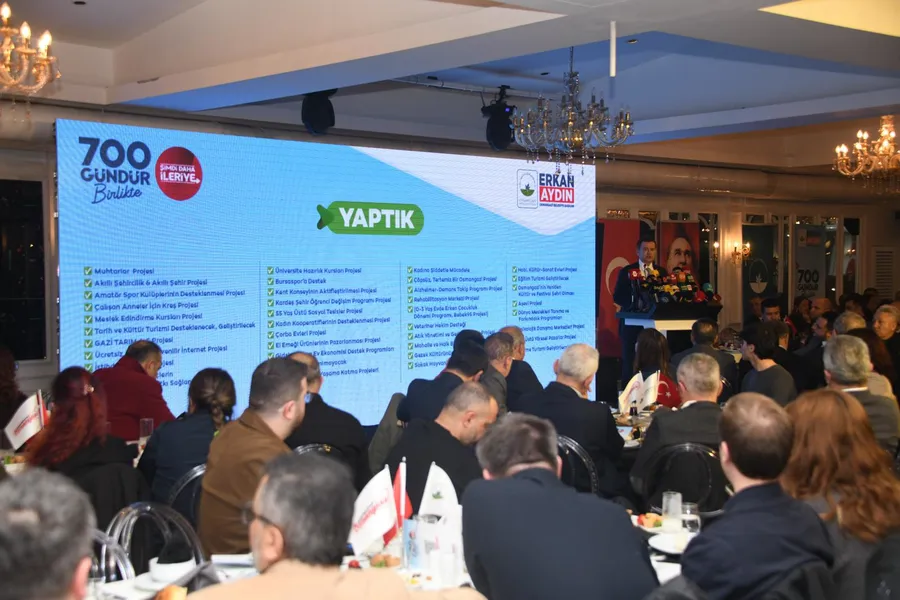 Daha önce seçim vaatlerini açıkladığı aynı mekanda, 700 gün sonra basın mensuplarıyla yeniden bir araya gelen Başkan Aydın’ın toplantısına; CHP Genel Başkan Yardımcısı Nurhayat Altaca Kayışoğlu, CHP Bursa Milletvekili Orhan Sarıbal, CHP Parti Meclisi Üyesi Canan Taşer, CHP Bursa İl Başkanı Nihat Yeşiltaş, CHP Bursa İl Başkan Yardımcısı İsmail Altay, CHP Osmangazi İlçe Başkanı Raşit Gürbüz, Nilüfer Belediyesi Başkanvekili Salih Güleç, belediye başkan yardımcıları, meclis üyeleri ile birim müdürleri katılım sağladı.
