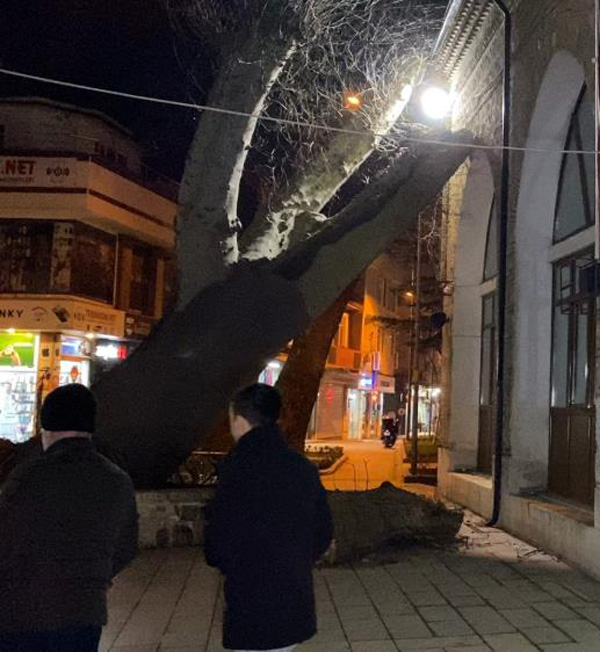 Bursa’nın İnegöl İlçesi’ndeki 600 yıllık İshakpaşa Camii'nin girişinde bulunan asırlık çınar ağacı kökünden çıkarak devrildi. Caminin duvarına dayanan ağacın gövdesinden parçalar yere düştü. Olay sırasında kimsenin olmaması olası faciayı önledi.