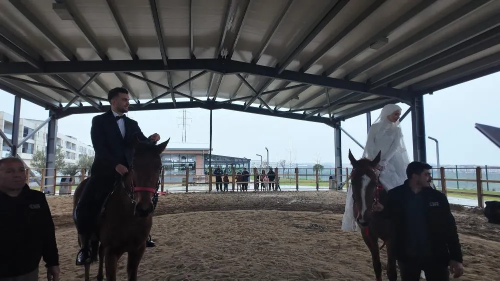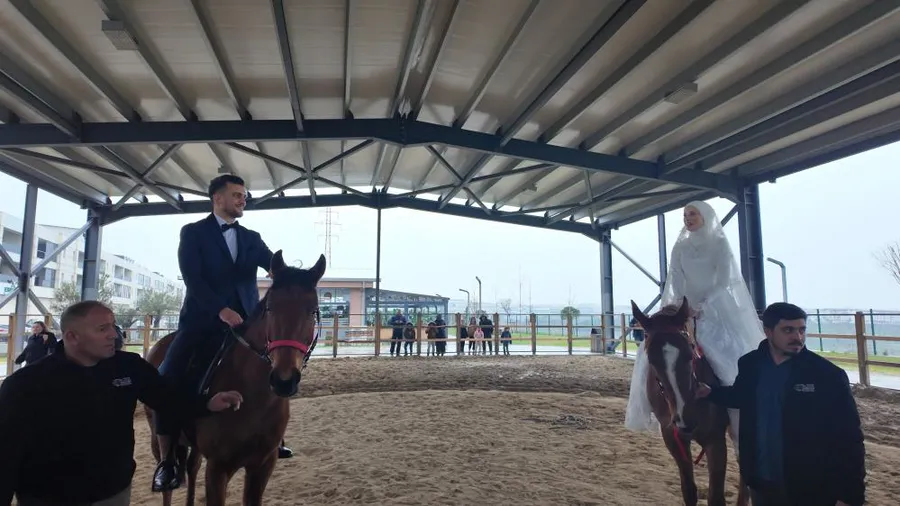 İstanbul’un Esenyurt İlçesi yaşayan Behçet Demir ve Dilara Eren çifti sıra dışı bir organizasyon ile nikah kıyarak dünya evine girdi. Esenyurt’ta bir süre önce belediyeye ait at binicilik tesisinde tanışan Behçet Demir ve Dilara Eren, aldıkları evlilik kararının ardından klasik bir nikah töreni yerine ortak tutkularını yansıtan bir tören yapmak istedi. Gelinlik ve Damatlıkla ata binen çift, çevredekilerin şaşkın bakışlarıyla dünya evine girdi.