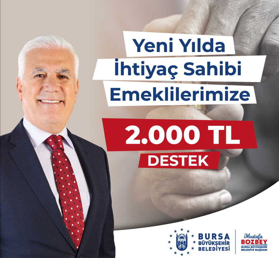 Ekonomik krizin en çok etkilediği kesimlerin başında gelen emekliler için Bursa Büyükşehir Belediyesi önemli bir adım attı. Başkan Bozbey, yeni sene öncesi ihtiyaç sahibi emeklilere 2.000 TL'lik desteği müjdeledi.