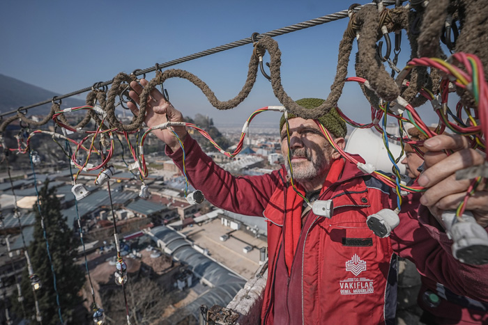 Yerden yüksekliği 70 metre olan Ulucami minarelerine çıkan mahya ustaları, uzun süren çalışmanın ardından ibadethaneye mahyaları astı.