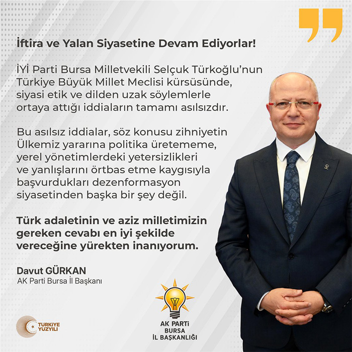 AK Parti Bursa İl Başkanı Davut Gürkan, sosyal medya hesabı X üzerinden yaptığı açıklamada İYİ Parti Bursa Milletvekili Selçuk Türkoğlu'nu sert ifadeler kullanarak eleştirdi. Gürkan, Türkoğlu’nun yaptığı açıklamalarda yalan ve iftiralarla gündem oluşturma çabasında olduğunu belirtti.