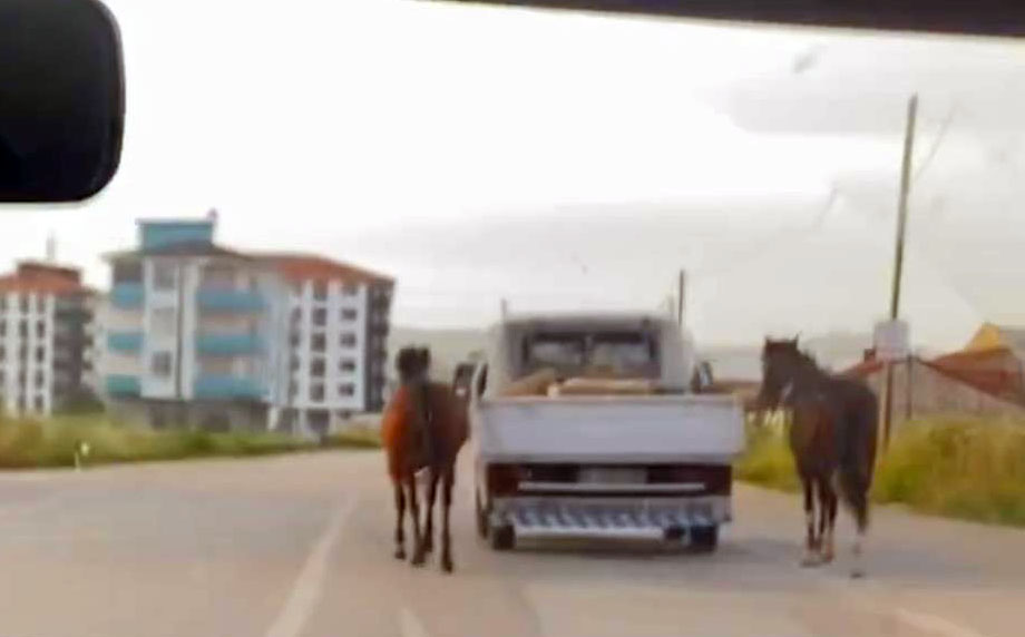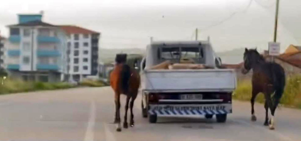 Bursa'nın Yenişehir İlçesi’nde kamyonet sürücüsü, aracın arkasına bağladığı atları kilometrelerce koşturdu. Vicdanları yaralayan sürücüye trafikteki vatandaşlar tepki gösterdi. Aldırış etmeyen adam yoluna devam etti.