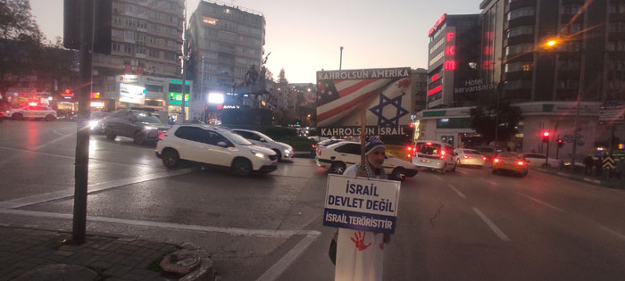 Ellerinde pankartlar ve ‘kanlı el’ beyaz kıyafetleriyle sessiz şekilde Siyonist İsrail’in Gazze’deki katliamına hatırlatan gönüllüleri görenler, şaşkınlıklarını gizleyemedikleri gibi öğretmenlere destek veriyor. AK Parti İl Binası önünde gezinmelerine izin verilmeyen, yaklaşık 2 yıldır Fomara Meydanı’nda mesai saati sonra buluşan kamu görevlileri, bıkıp usanmadan Siyonist vahşete dikkat çekiyor, İsrail ile ticaretin yapılmaması uyarısında bulunuyorlar.