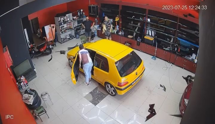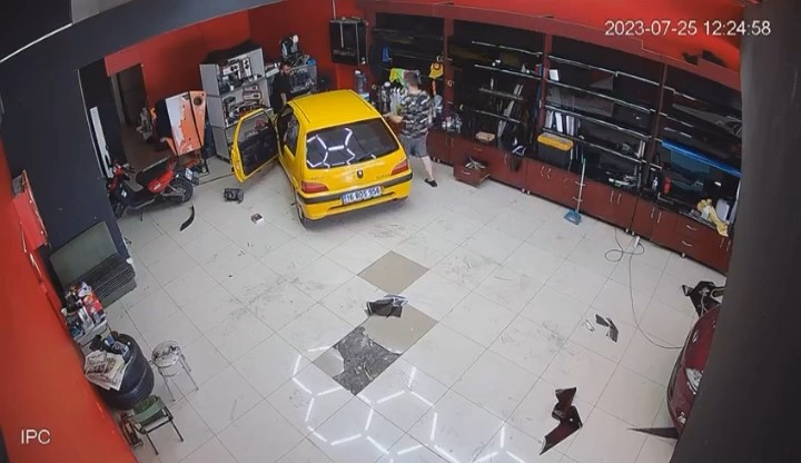 Daha sonra direksiyon başına geçen sürücü, yanlışlıkla fren yerine gaza basınca önce dükkan sahibine, ardından dükkanın içindeki malzemelere çarpıp durdu. Facianın eşiğinden dönülürken herkes kısa süreli şok yaşadı. O anlar güvenlik kamerasına saniye saniye yansıdı.