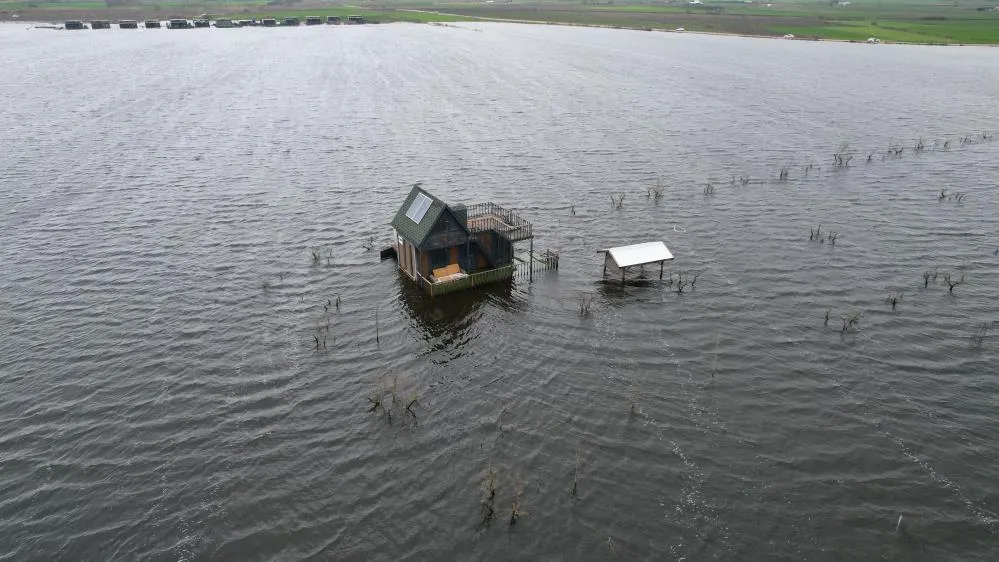 Bölgede oluşan taşkın dron ile havadan görüntülenirken, ortaya çıkan manzara gölün ne denli geniş bir alana yayıldığını gözler önüne serdi.