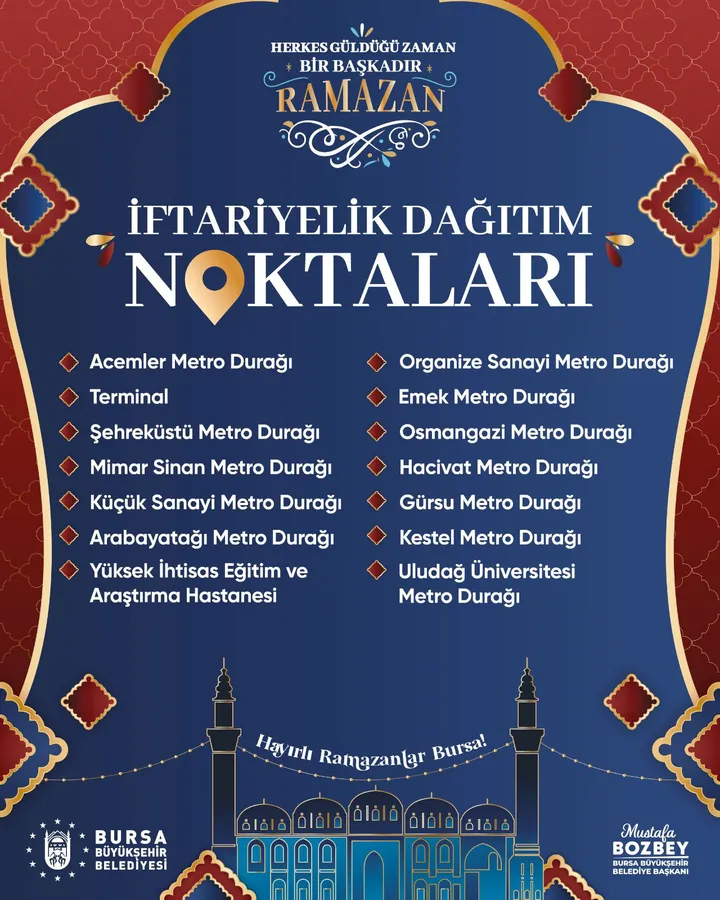 Bu kapsamda; Osmangazi’de Fomara Fevzi Çakmak Katlı Otoparkı, Yıldırım’de Emirsultan Meydanı ve Değirmenönü Mahallesi Elvan Düğün Salonu ile İnegöl’de Çarşı İçi Alan Otoparkı (BURPARK) olmak üzere toplam 4 sabit iftar noktasında vatandaşlarımızı ağırlıyoruz.