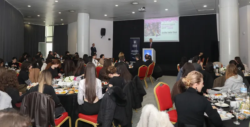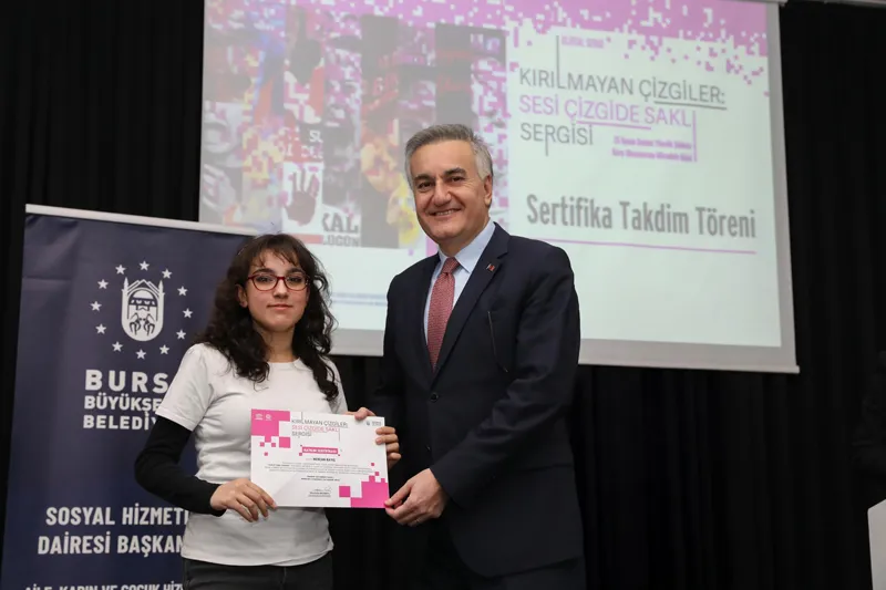 Dijital afiş sergisi kapsamında eser üreten öğrencilere, Atatürk Kültür Merkezi Merinos Yerleşkesi’nde düzenlenen törenle sertifikaları verildi. Programa, Bursa Büyükşehir Belediye Başkanı Mustafa Bozbey’i temsilen Bursa Büyükşehir Belediyesi Başkanvekili Mustafa Orkun Gazioğlu, okul yöneticileri, öğretmenler ve öğrenciler katıldı.