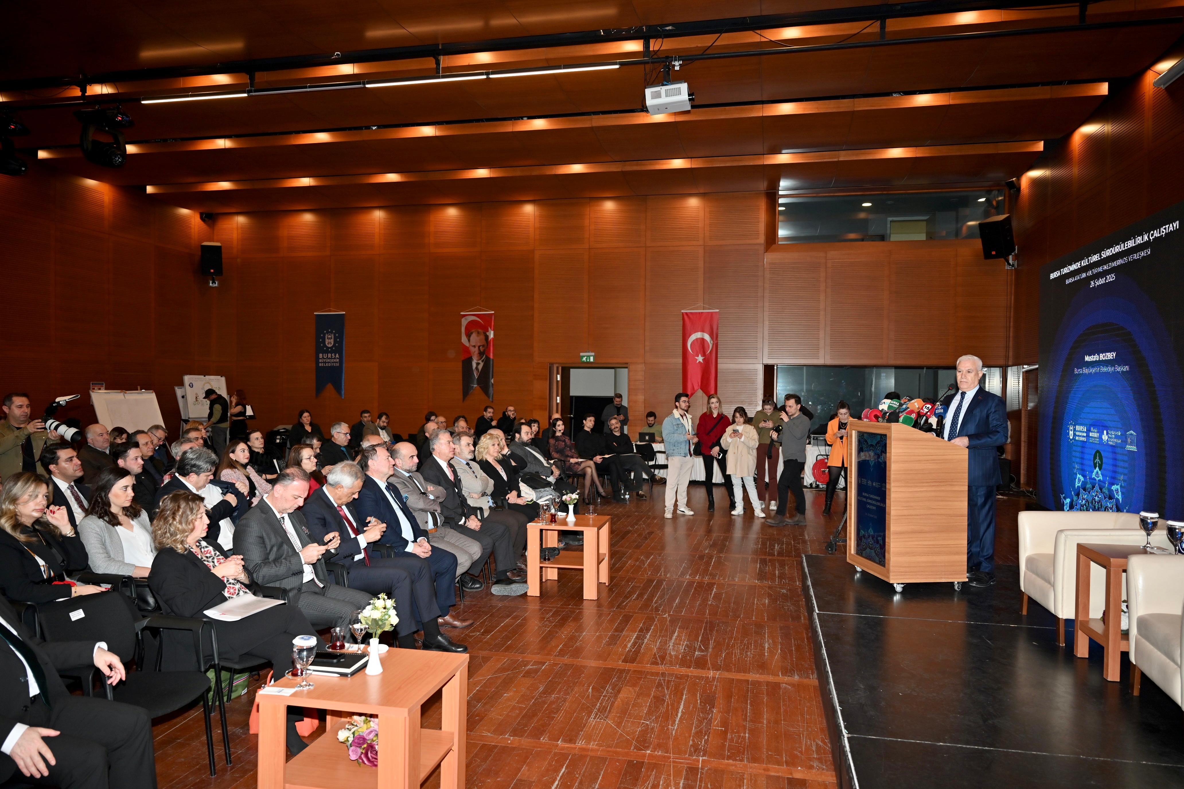 Bursa Büyükşehir Belediyesi, kentin kültürel değerlerini korumak, geleceğe taşımak ve turizm potansiyelini güçlendirmek amacıyla 'Bursa Turizminde Kültürel Sürdürülebilirlik Çalıştayı' düzenliyor. Sürdürülebilir Turizm Koordinasyon Merkezi’nin çalışmaları kapsamında Merinos Atatürk Kongre Kültür Merkezi’nde gerçekleştirilen çalıştayda, iki gün boyunca 77 konuşmacının katılımıyla 16 oturum yapılacak. Turizm sektörünün uzman isimleri ve paydaşları, bir kültür turizmi destinasyonu olan Bursa’nın kültürel sürdürülebilirliğini tartışacak. Çalıştayın açılış programına Bursa Büyükşehir Belediye Başkanı Mustafa Bozbey’in yanı sıra Türkiye Turizm Tanıtım ve Geliştirme Ajansı Genel Müdür Yardımcısı Dr. Elif Balcı Füsunoğlu, İl Kültür ve Turizm Müdürü Dr. Kamil Özer, Mudanya Üniversitesi Rektörü Prof. Dr. Emin Karip, TÜRSAB Güney Marmara BTK Başkanı Murat Saraçoğlu, Büyükşehir Belediyesi genel sekreter yardımcıları ve daire başkanları, akademisyenler, turizm sektörünün temsilcileri ve sivil toplum kuruluşlarının yöneticileri katıldı.