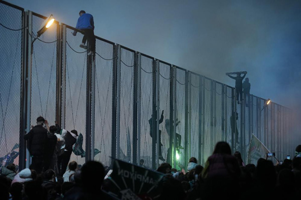 Antrenman sahasındaki tel örgülere tırmanan taraftarlar, tehlikeyi göze alarak tezahürat yaptılar.