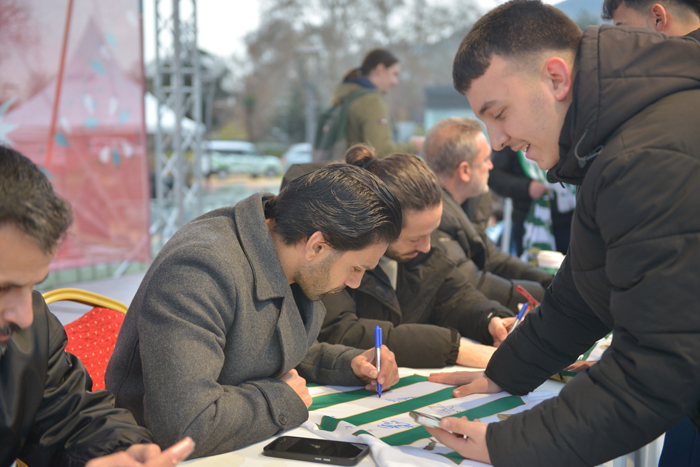 Öte yandan Bursaspor Başkanı Enes Çelik, Teknik Direktör Tahsin Tam ve futbolcular Taha Batuhan Yayıkçı, Muhammed Demir ve İlhan Depe de Yeni Yıl Meydanı’nda düzenlenen imza gününde taraftarlarla bir araya geldi. Programa yoğun ilgi gösteren yeşil beyazlı taraftarlar, uzun kuyruklar oluşturarak tezahüratlar eşliğinde forma ve atkılarını imzalattırdı. Bursaspor’a olan sevgilerini bir kez daha gösteren taraftarlar, gönül verdikleri takımın futbolcularıyla fotoğraf çektirme imkanı buldu. Kendilerine gösterilen ilgiden memnuniyet duyduklarını ifade eden futbolcular, taraftar desteğinin kendileri için büyük bir motivasyon kaynağı olduğunu belirtti. Bursa Büyükşehir Belediyesi’nin ‘Mücadelede Yanındayım’ diyerek destek verdiği organizasyon, yeşil-beyazlı renklere olan bağlılığı da güçlendirdi.