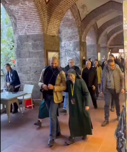 Rahibelerin klasik beyaz örtülerinin yerine gri renkte örtü taktıkları, siyah uzun elbiselerinin yerine lacivert kıyafetleri dikkat çekti.