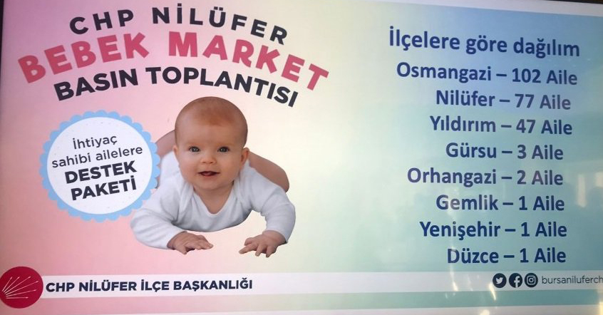 Ekonomik sıkıntı, korona virüs sürecinde dar gelirlileri zor duruma düşürmesine kayıtsız kalmayan CHP Nilüfer İlçe Başkanlığı, ihtiyaç sahibi aileler için başlatılan bebek bezi, mama, pişik kremi ve ıslak mendil gibi temel ihtiyaç malzemeleri desteğini içeren ‘Bebek Market Dayanışma Kampanyası’nın sonuçlarını paylaştı.