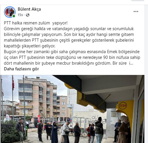 Cumhuriyet Halk Partisi Osmangazi Belediyesi Meclis Üyesi Bülent Akça, 90 bin kişinin yaşadığı Emek bölgesinde 3 PTT şubesinin 1’e düşürülmesinden dolayı vatandaşların mağdur edildiğini ifade etti. Sosyal medya hesabından halka yaşatılanlara tepki gösteren Akça, PTT’nin küçülmeye gitmesinin vatandaşı mağdur ettiğini belirtti.