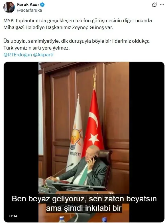 AK Parti Genel Başkan Yardımcısı Faruk Acar, sosyal medya hesabından Cumhurbaşkanı Recep Tayyip Erdoğan'ın Mihalgazi Belediye Başkanı Zeynep Güneş ile yaptığı telefon görüşmesine ilişkin paylaşımda bulundu.