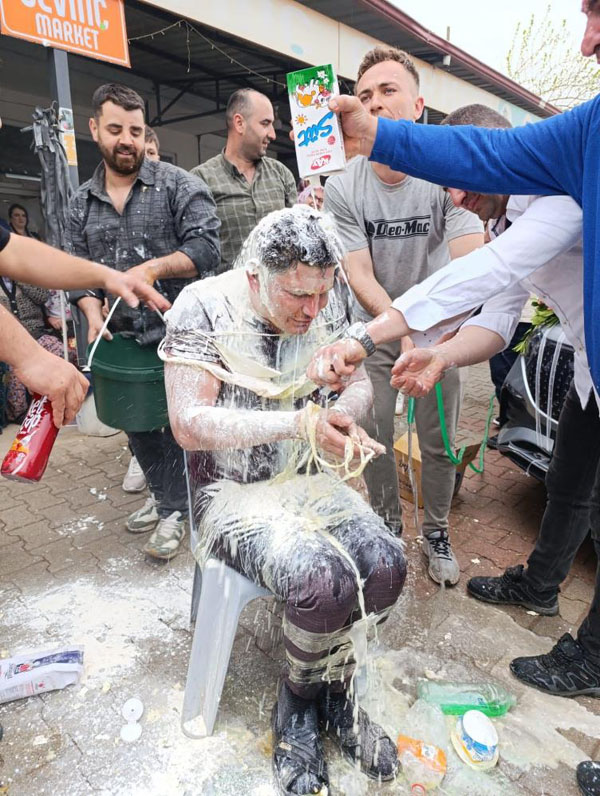 Mahalle arkadaşları önce düğün konvoyunun önünü kesip damattan hediyeleri aldılar, ardından meydanda sandalyeye bağladılar. Arkadaşları, damadın başında yumurta kırıp, un, süt, ketçap ve mayonez döktü. Dakikalarca süren eğlence sonunda damat Sevinç, son olarak arkadaşları tarafından su dökülerek yıkandı. Görülmemiş eziyetin ardından damat düğüne uğurlandı.