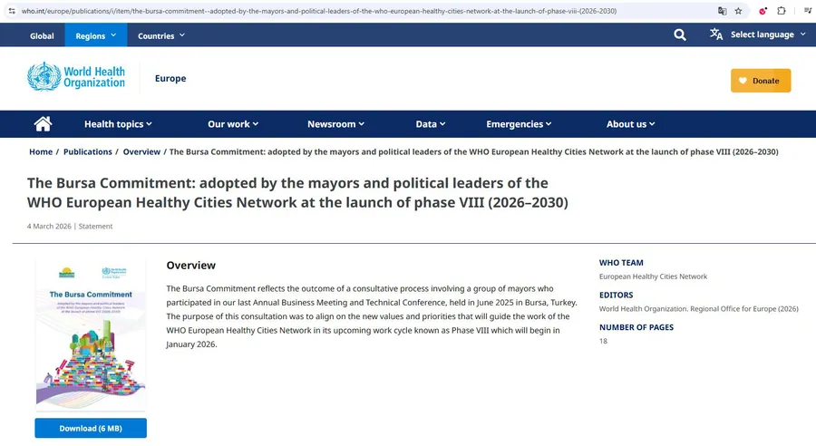 Dünya Sağlık Örgütü (DSÖ) Avrupa Sağlıklı Şehirler Ağı’nda belediye başkanları ile siyasi liderler tarafından kabul edilen ve kamuoyuna duyurulan ‘Bursa Taahhüdü’, uluslararası alanda da karşılık buldu.