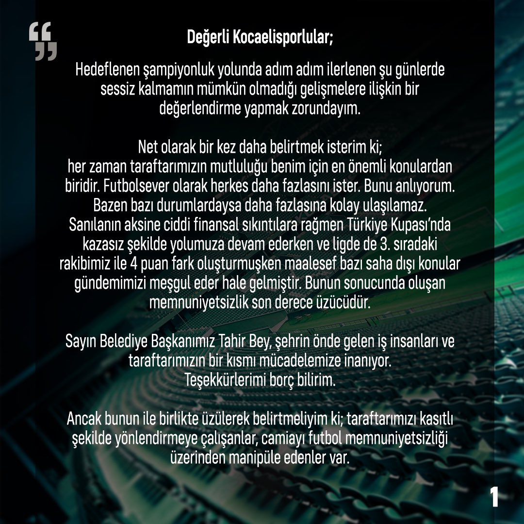Ancak bununla birlikte üzülerek belirtmeliyim ki; taraftarımızı kasıtlı şekilde yönlendirmeye çalışanlar, camiayı futbol memnuniyetsizliği üzerinden manipüle edenler var. Takım lig lideriyken ortada çözülemeyecek bir problem yokken 'Hocanın gönderilme' konusunu gündeme getirenler bu durumu planlı bir şekilde Esenler Erok maçına da protesto olarak yansıttı. Bazı taraftarlarımız da maalesef bu yönlendirmelerle hareket etti. Kişisel hırs ve kaprisler camiamızı etkilememeli. Maalesef Kulüp Başkanının Esenler Erok maçı sonrası yaptığı açıklamalar fikir ve gönül birlikteliğinin olmadığını göstermiştir. Ben tam 40 yıldır profesyonel futbolun içinde yer alan biri olarak görev ve yetki alanlarımı hiç bir zaman aşmadım. Bugün de iyi giden bir sürecin art niyetli bir anlayışla adeta sabote edilmesine sessiz kalmam mümkün değil. Sonu şampiyonlukla noktalanacağına emin olduğum hedeften alıkonularak, aynı çatı altında tek yürek olmayı başarmak, geldiğimiz nokta itibariyle maalesef mümkün görünmüyor. Bu nedenle kulüp Başkanının da dolaylı yoldan ilettiği taleplerine kayıtsız kalmayarak sözleşmemi bugün itibariyle sonlandırıyorum. Ligin geri kalan sürecinde Kocaelispor camiasına ve taraftarına başarılar diliyorum' ifadelerini kullandı.
