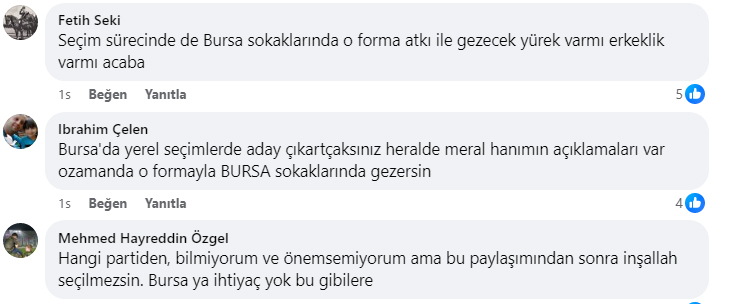 Fetih Seki isimli taraftar da,  “Seçim sürecinde de Bursa sokaklarında o forma atkı ile gezecek yürek var mı erkeklik var mı acaba?” diye sordu.