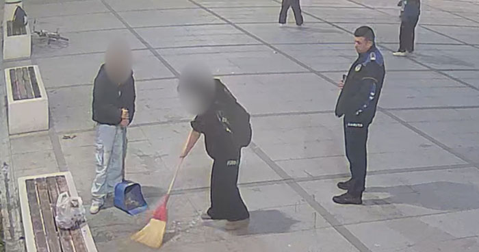 İzleme ve Değerlendirme Merkezindeki ekipler tarafından merkez park heykel önünde bir grup gencin çekirdek ve yanında farklı yiyecekler yedikleri, çekirdek kabuklarını yere atıp, diğer yiyeceklerin çöplerini de ortada bıraktıkları tespit edildi. Alanda oluşan ciddi seviyedeki kirliliğe zabıta ekipleri anında müdahale etti. Zabıta personeli çevre kirliliğine sebebiyet veren gençleri tespit etti. Oluşan çevre kirliliğini gidermek için gençlere süpürge ve kürek verilerek kirlettikleri yer temizletildi. Yere atılan çöpler toplatıldı. Ardından çevre kirliliğine sebebiyet veren kişilere kabahatler kanunu kapsamında idari para cezası da uygulandı. Ayrıca yapılan davranışın doğru olmadığı hatırlatılarak, çevre temizliği konusunda daha hassas olmaları uyarısı yapıldı.