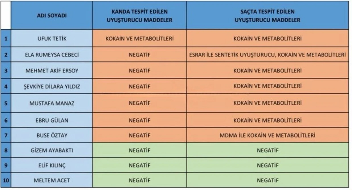 Yapılan incelemenin ardından Adli Tıp Kurumu’ndan bir rapor geldi. İstanbul Cumhuriyet Başsavcılığı kaynakları, Mehmet Akif Ersoy’un uyuşturucu testinin pozitif çıktığını doğruladı. Ela Rümeysa Cebeci’nin de uyuşturucu testinin pozitif çıktı.