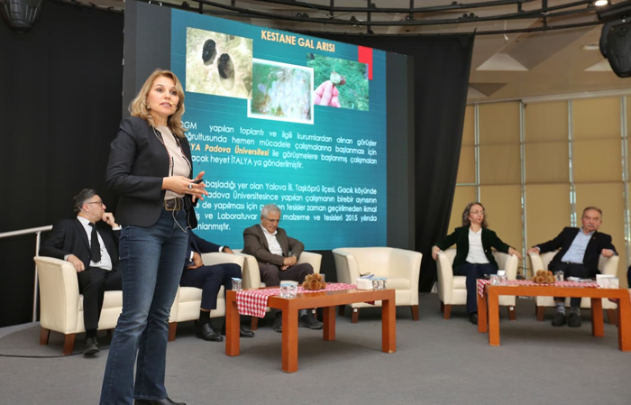 Panelin ilk bölümünde Bursa kestanesinin mevcut durumu, üretimdeki zorluklar, sorunlar ve talepler ele alındı. Moderatörlüğünü Bursa Uludağ Üniversitesi’nden (BUÜ) Prof. Dr. Cevriye Mert’in yaptığı birinci oturumda, Bursa Kent Konseyi Başkanı Prof. Dr. Ertuğrul Aksoy ‘İklim değişiklikleri ile oluşabilecek riskler’, BUÜ’den Doç. Dr. Himmet Tezcan ‘Kestane hastalıkları ve mücadelesi’, Bursa Teknik Üniversitesi’nden (BTÜ) Prof. Dr. Oğuzhan Sarıkaya ‘Kestane gal arısı ile alternatif savaş yöntemleri’, Bursa İl Tarım Müdürlüğü’nden Dr. Kıymet Senan Savaş ‘Kestane zararlıları ve mücadelesi’, Orman Bölge Müdürlüğü’nden Orman Yüksek Mühendisi Özden Açıcı ‘Biyolojik mücadele ve toplama alanlarındaki güvenlik önlemleri’, üretici Ertuğrul Sünel ‘Üretimde yaşanılan sorunlar ve talepler’ hakkında bilgi verdi.