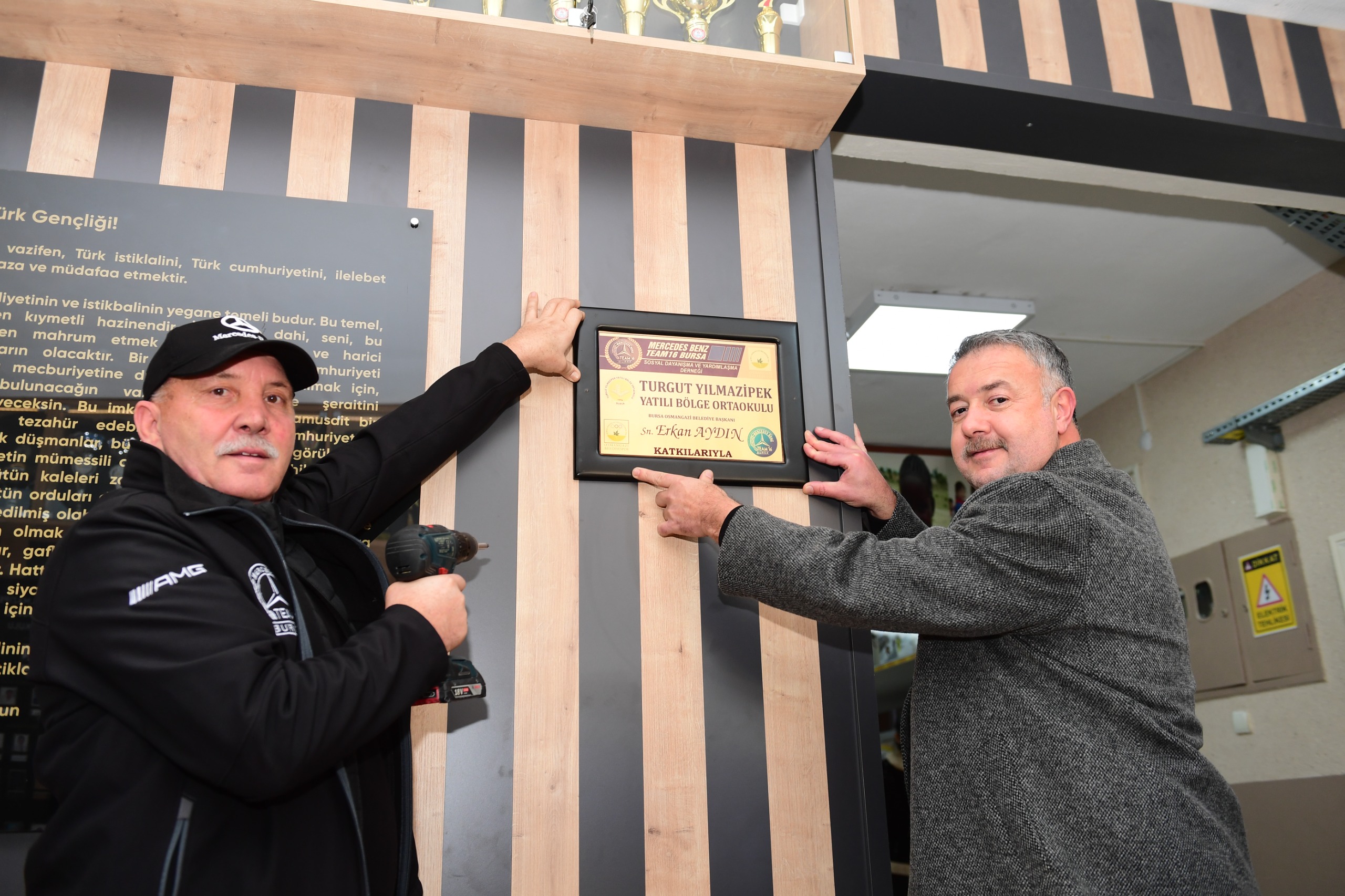 Turgut Yılmazipek Yatılı Bölge Ortaokulu’na desteklerinden dolayı Osmangazi Belediye Başkanı Erkan Aydın’ın ismi, okuldaki bir sınıfa verildi. Tabelayı Osmangazi Belediyespor Kulübü Başkanı Karayılan ve dernek üyeleri birlikte astı.