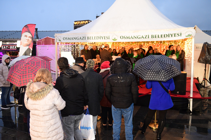 Osmangazi Belediyesi’nin ev sahipliğinde Osmangazi Meydanı’nda Bursalıları ağırlayan Yeni Yıl Festivali, 2026’ya sayılı günler kala vatandaşların ilgi odağı olmaya devam ediyor. Festivalin üçüncü haftası geride kalırken, etkinlikler kapsamında Uludağ Sanat Derneği Müzeyyen Senar Türk Sanat Müziği Korosu sahne aldı. Repertuvarında Türk sanat müziğinin dillere pelesenk olan seçkin eserlerine yer veren Hilmi Bozdemir şefliğindeki koro, soğuk havaya rağmen kendilerine yoğun ilgi gösteren dinleyicilerinin yüreklerini ısıttı. Performanslarıyla beğeni toplayan koro üyeleri, Bursalıları festivalde geçmişe doğru bir yolculuğa çıkardı.