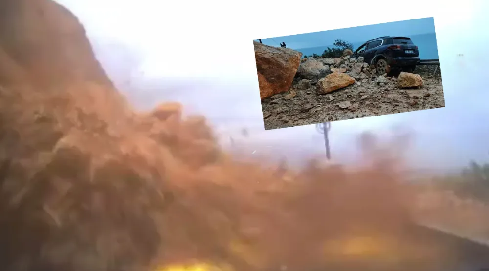 Seyir halindeki araç Mersin-Antalya Karayolunun Aydıncık ilçesi sınırlarında yamaçlardan kopan toprak ve kaya parçalarının altında kaldı. Korku dolu anlar otomobilin kamerasına yansırken, sürücü ölümden döndü.