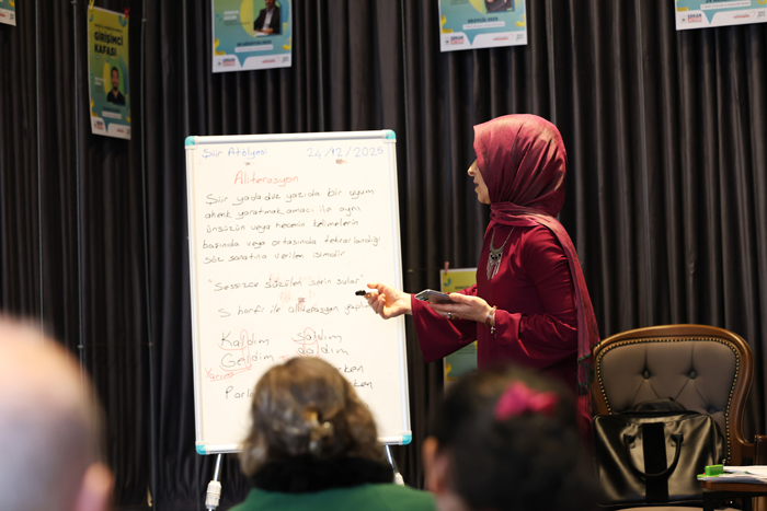 Şiir yazmaya gönül verenlerin yazdıkları şiirleri kural ve tekniğine uygun bir şekilde yazmasını öğrenmesi için açılan ‘Şiir Atölyesi’nde geleceğin şair adayları yetişiyor. Gençlik ve Girişimcilik Merkezi’nde düzenlenen Şiir Atölyesi’ne gelen amatör anlamda şiir yazan kursiyerler, merkezde şiirin 6 dalının tüm teknik detaylarını ayrıntılarıyla birlikte öğrenme imkanı buldu. 3 hafta devam eden ‘Şiir Atölyesi’nin son dersine katılan kursiyerler öğrendikleri bilgilerle teknik anlamda birer dörtlük yazarak kursu verimli bir şekilde tamamladığını herkese gösterdi.