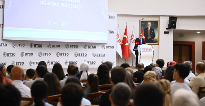 BTSO Yönetim Kurulu Başkanı İbrahim Burkay, “Ülkemizin en parlak zihinleri arasına girdiğiniz için her birinizi ayrı ayrı kutluyorum.” ifadeleriyle başladığı konuşmasında, üniversite hayatında gösterecekleri azim, gayret ve öğrenme iştahının öğrencilere sürdürülebilir başarının kapılarını aralayacağını söyledi. Türkiye’nin tarihinin, imkânsız denilen engelleri aşan insanların destanlarıyla dolu olduğunu belirten İbrahim Burkay, “Cumhuriyetin ilk yıllarında fabrikasız, elektriksiz köylerden başlayan yürüyüş, bugün kendi otomobilini üreten, uydusunu uzaya gönderen, yazılımda ve yapay zekâda dünyayla yarışan bir ülkeye dönüştü. Dün “yapamazsınız” diyenler vardı; bugün “nasıl yaptınız?” diye soruyorlar. Bizim için ülkemizin büyümesi önemlidir fakat kalkınmak çok daha kıymetlidir. Yollar, köprüler, fabrikalar büyümenin işaretidir. Kalkınma ise bunların insanımızın hayatına değer katması, refahı artırması, adaleti güçlendirmesidir. Sizlerin görevi, ülkemizi hem büyüten hem de kalkındıran nesil olmaktır.” dedi.