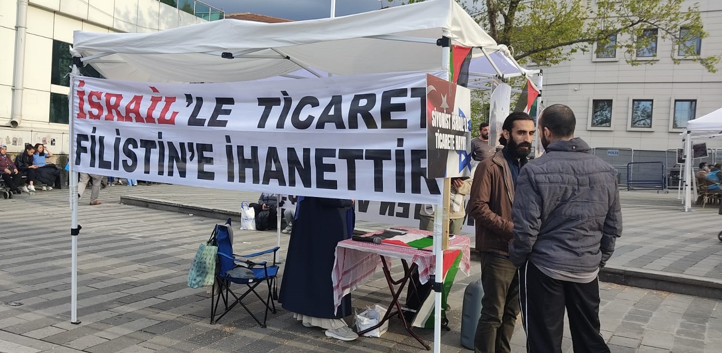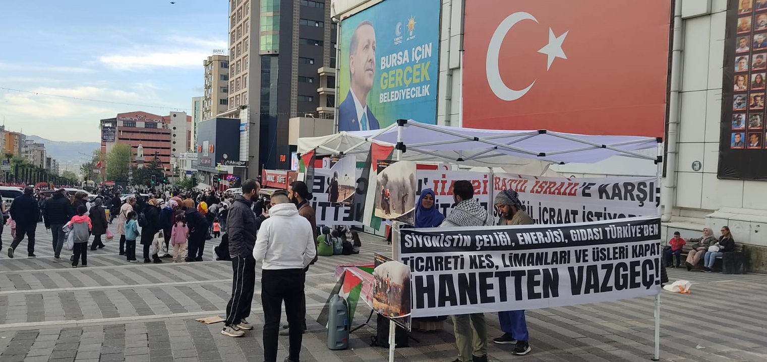 Bursa’nın en işlek aksı olan Osmangazi İlçesi’ndeki Şehreküstü Meydanı’ndaki çadırın etrafına asılan pankartlarda, ‘Siyonist’in çeliği, enerjisi Türkiye’den. Ticareti kes, limanları ve üsleri kapat. İhanetten vazgeç” şeklinde ifadelere yer verilirken, bir başka pankartta ise, İsrail’le Ticaret, Filistin’e ihanettir” sözleri dikkat çekti.