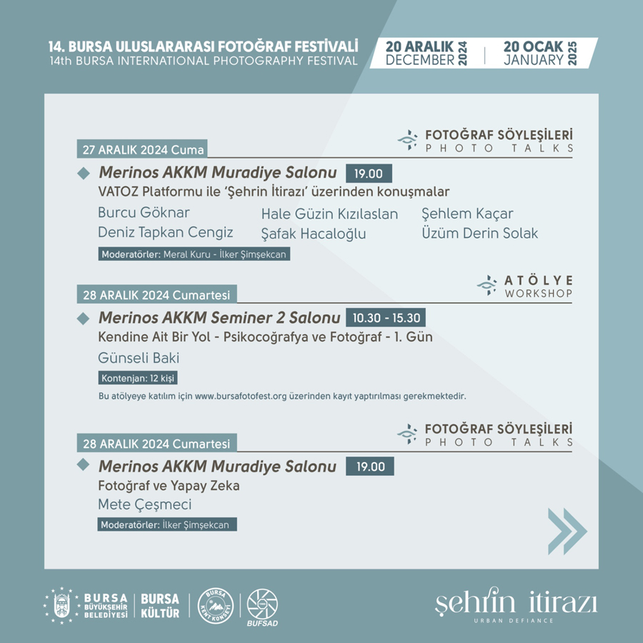 Bursa Büyükşehir Belediyesi’nin, Bursa Kent Konseyi ve BUFSAD işbirliğiyle bu yıl 20 Aralık-20 Ocak tarihleri arasında düzenleyeceği 14. Bursa Uluslararası Fotoğraf Festivali (Fotofest), bir kez daha fotoğraf tutkunlarını Bursa’da buluşturuyor. ‘Şehrin İtirazı’ temasıyla hazırlanan festival kapsamında 33 solo sergi, ulusal ve uluslararası katılımlı grup sergiler, eser sahiplerinin de katılımıyla fotoğraf tutkunlarıyla buluşacak.