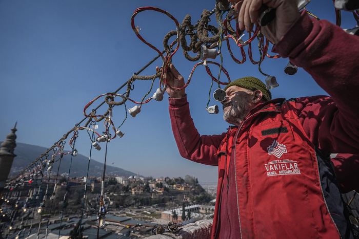 Yerden yüksekliği 70 metre olan Ulucami minarelerine çıkan mahya ustaları, uzun süren çalışmanın ardından ibadethaneye mahyaları astı.