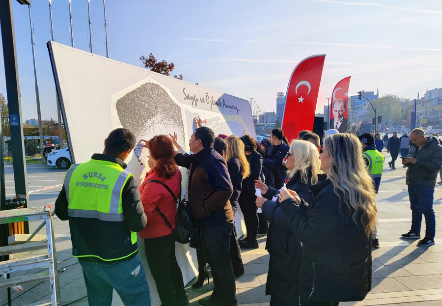 Bursa Büyükşehir Belediyesi tarafından Ulu Önder Mustafa Kemal Atatürk’ün hatırasını yaşatmak adına kente kazandırılan ‘Atatürk Heykeli’ de Kent Meydanı’nda törenle açıldı. Törene, Büyükşehir Belediye Başkanı Mustafa Bozbey ve eşi Seden Bozbey’in yanı sıra siyasi partilerin temsilcileri, Bursa milletvekilleri, belediye başkanları, Büyükşehir Belediyesi bürokratları ve vatandaşlar katıldı. Tören alanında Park ve Bahçeler Dairesi Başkanlığı Kent Estetiği Şube Müdürlüğü tarafından anlamlı bir etkinlik de hazırlandı. Büyük bir panoya boyayla parmak basan Bursalılar tarafından Atatürk ve Türk Bayrağı silueti oluşturuldu. Başkan Mustafa Bozbey ve protokol üyeleri de panoya parmak basarak eserin oluşmasına katkıda bulundu.