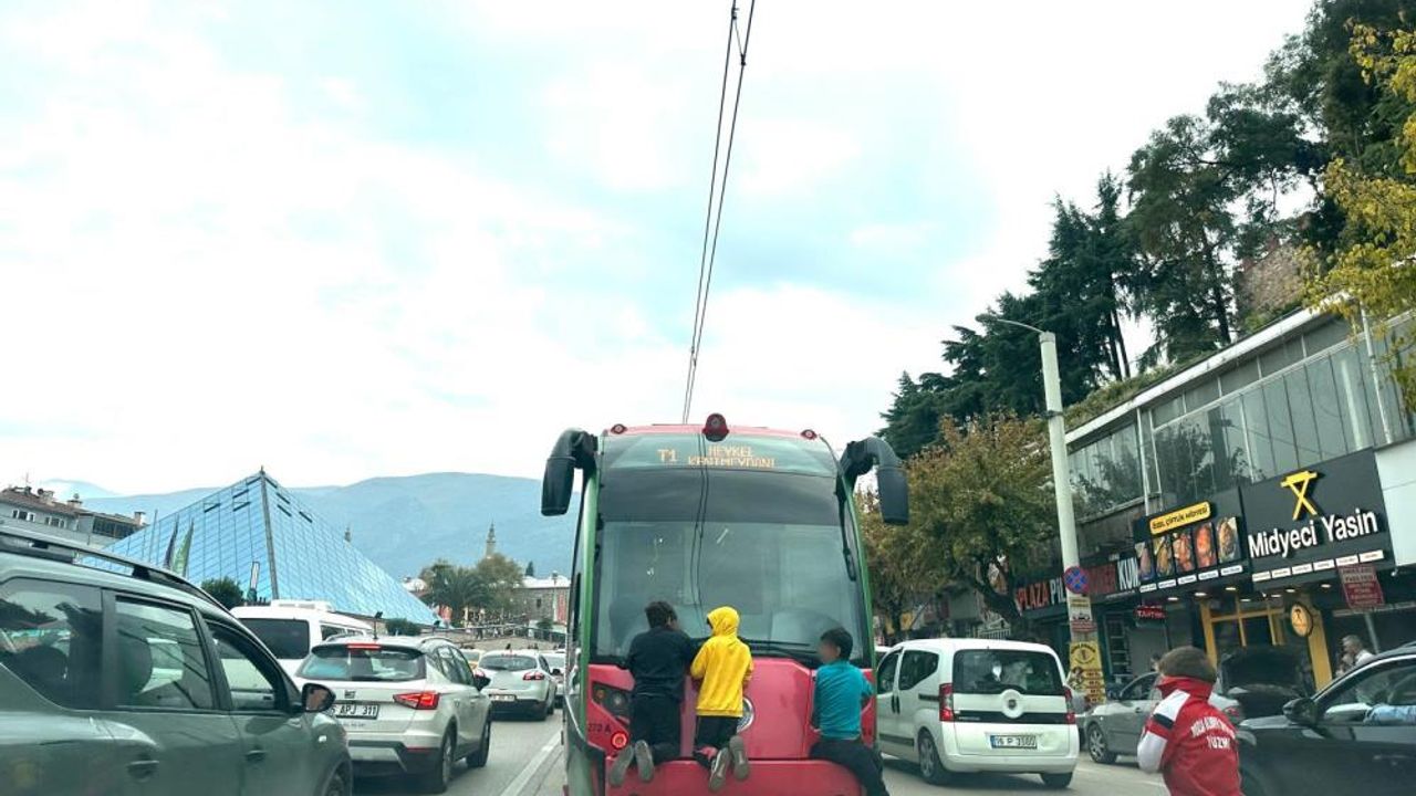 Olay, Bursa’nın Osmangazi ilçesinde Çatal Fıran aksında meydana geldi. Dört çocuk, hareket halindeki bir tramvayın arkasına tutunarak dakikalarca yolculuk yaptı. Trafikte ilerleyen çocukların rahat tavırları pes dedirtirken o anları görenlerin tepkisizliği de pes dedirtti. Her an düşüp ağır şekilde yaralanma riski taşıyan çocukların tehlikeli yolculuğu cep telefonu kamerasıyla kaydedildi.