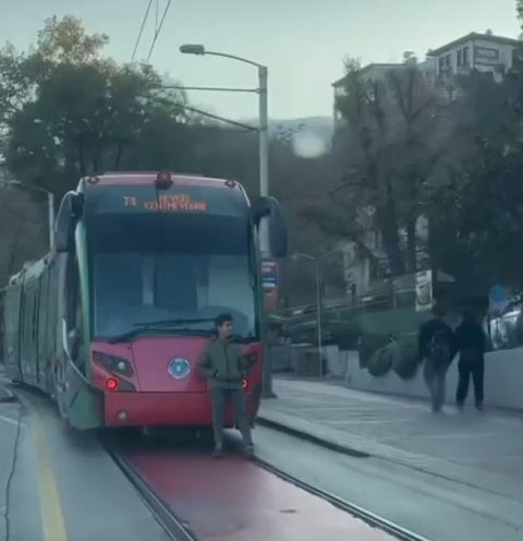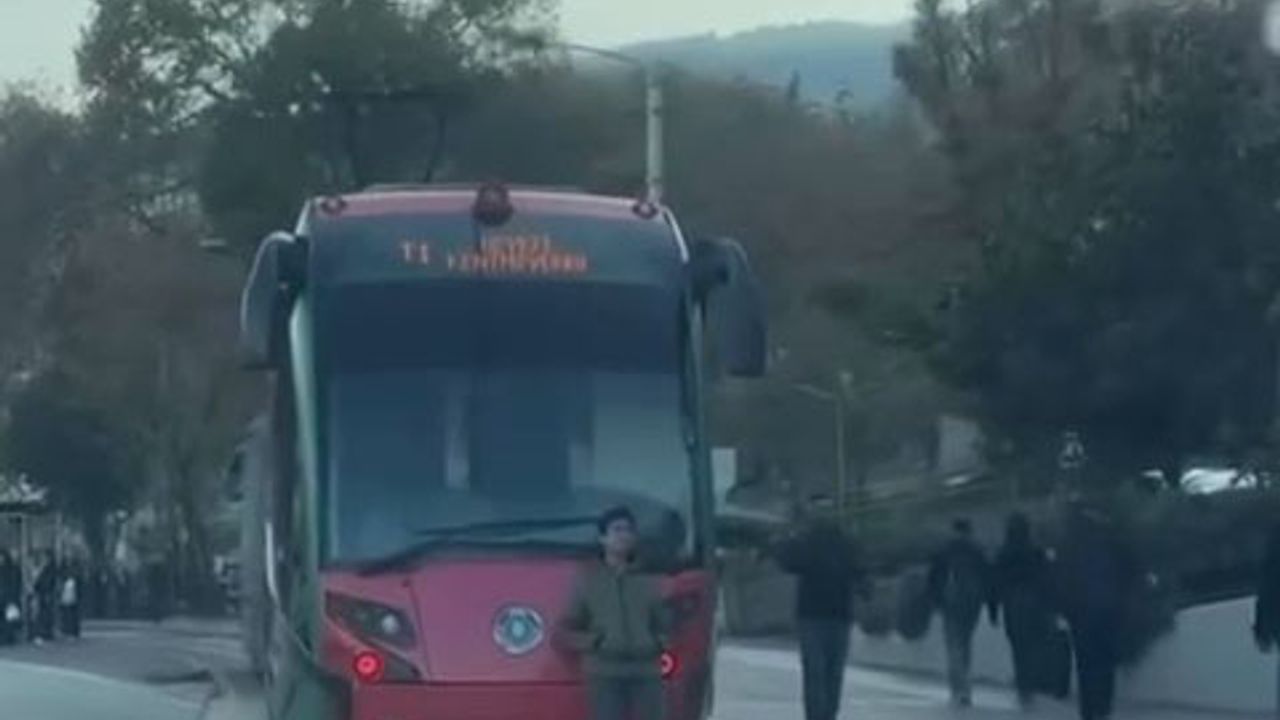 Bursa’nın Osmangazi İlçesi’nde ulaşımı sağlayan İpek Böceği tramvayının arka bölümüne tutunup oturarak ilerleyen çocuğu fark eden vatandaşlar, duruma tepki gösterdi. Trafiğin yoğun olduğu güzergahta ölümle burun buruna gelen çocuğun, tramvayla uzun bir süre bu şekilde seyahat ettiği öğrenildi.