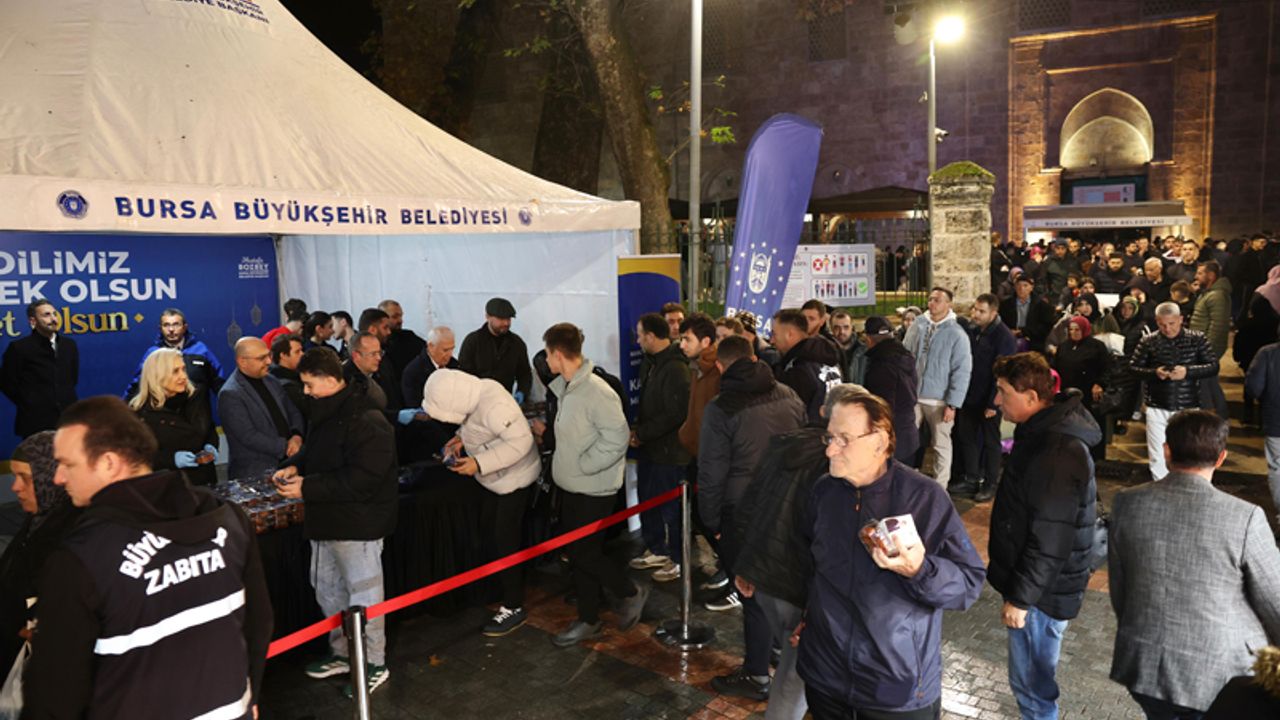 Regaip Kandili, tüm yurtta olduğu gibi Bursa’da da birlik ve beraberlik içerisinde yaşandı. Bursa Büyükşehir Belediyesi, kentin 17 ilçedeki 21 farklı camide vatandaşlara tatlı ikram ederken, Bursa Büyükşehir Belediye Başkanı Mustafa Bozbey de Ulu Cami’de vatandaşlarla bir araya gelip kandillerini tebrik etti. Başkan Bozbey, bu anlamlı gecede vatandaşlara tatlı ikramında bulunarak manevi atmosferi paylaştı.
