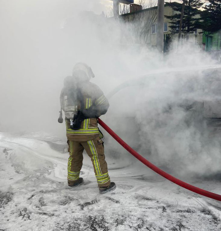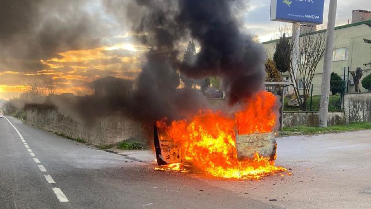 O sırada araç alev alev yanmaya başladı. Patlamaların da meydana geldiği yangında, itfaiye ekiplerinin söndürdüğü araçtan geriye iskeleti kaldı.