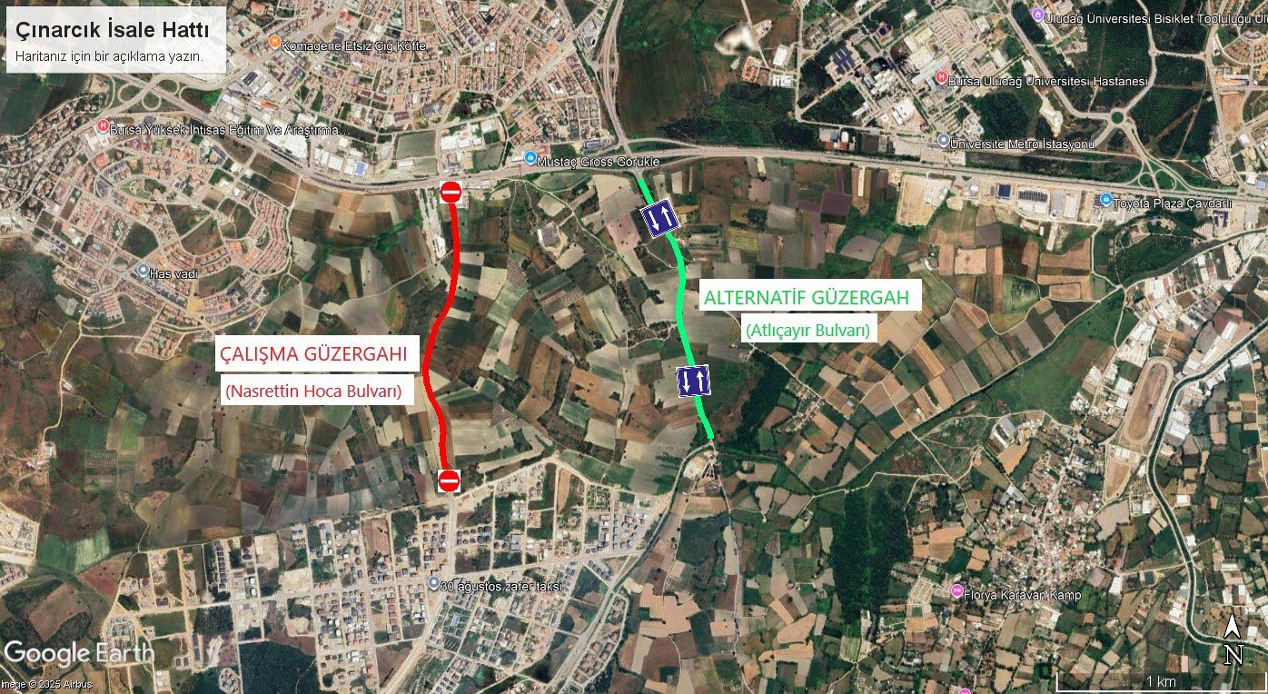 “BUSKİ Genel Müdürlüğü İçmesuyu Dairesi Başkanlığı tarafından yapılacak Çınarcık Su Projesi isale hattı çalışmaları kapsamında Nilüfer İlçesi, Kurtuluş Mahallesinde Nasrettin Hoca Bulvarı’nın İzmir Yolu caddesi bağlantısından Örencik Caddesi kesişimine kadarki kısmı 17 Ekim 2025 – 17 Kasım 2025 tarihleri arasında trafiğe kapatılacak olup ulaşım alternatif güzergahlardan sağlanacaktır. Çalışmalar süresince sürücülerin trafik işaret ve işaretçilerine uymaları gerekmektedir” denildi.
