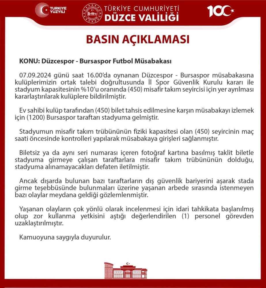 Yapılan açıklamada 450 kontenjan verilen Bursaspor taraftarlarının şehre daha kalabalık geldiği belirtilen açıklamada, “07.09.2024 günü saat 16.00'da oynanan Düzcespor - Bursaspor müsabakasına kulüplerimizin ortak talebi doğrultusunda il Spor Güvenlik Kurulu kararı ile stadyum kapasitesinin %10'u oranında (450) misafir takım seyircisi için yer ayrılması kararlaştırılarak kulüplere bildirilmiştir. Ev sahibi kulüp tarafından (450) bilet tahsis edilmesine karşın müsabakayı izlemek için (1200) Bursaspor taraftarı stadyuma gelmiştir. Stadyumun misafir takım tribününün fiziki kapasitesi olan (450) seyircinin maç saati öncesinde kontrolleri yapılarak müsabakaya girişleri sağlanmıştır. Biletsiz ya da aynı seri numarası içeren fotoğraf kartına basılmış taklit biletle stadyuma girmeye çalışan taraftarlara misafir takım tribününün dolduğu, stadyuma alınamayacakları defaten iletilmiştir. Ancak dışarda bulunan bazı taraftarların dış güvenlik bariyerini aşarak stada girme teşebbüsünde bulunmalar üzerine yaşanan arbede sırasında istenmeyen bazı olaylar meydana geldiği gözlemlemiştir. Yaşanan olayların çok yönlü olarak incelenmesi için idari tahkikata başlanılmış olup zor kullanma yetkisini aştığı değerlendirilen (1) personel görevden uzaklaştırılmıştır” denildi.
