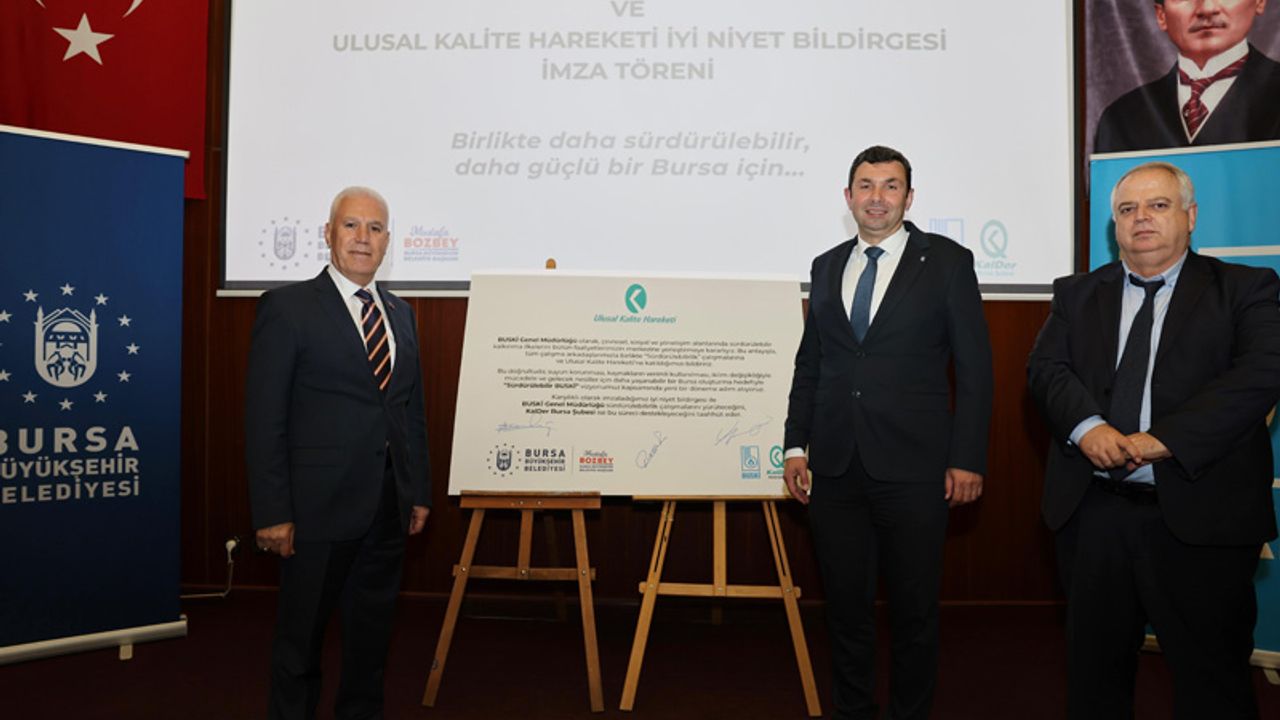 Bursa’da kalite odaklı hizmet anlayışıyla çalışmalarını sürdüren Büyükşehir Belediyesi, kurum kültürünü mükemmellik ekseninde geliştirmek ve Bursa’yı daha yaşanabilir, daha sürdürülebilir bir kent haline getirmek amacıyla tüm birimlerinde çalışmalarını sürdürüyor. Geçtiğimiz aylarda KalDer Bursa Şubesi ile Ulusal Kalite Hareketi İyi Niyet Bildirgesi’ni imzalayan Büyükşehir Belediyesi, iştiraklerde de EFQM Mükemmellik Modeli sürecini tüm hızıyla yürütüyor. Bu kapsamda BUSKİ’nin yönetim modelini, hizmet anlayışını ve kurumsal vizyonunu mükemmellik ve sürdürülebilirlik ekseninde yeniden şekillendirmek amacıyla Bursa Büyükşehir Belediye Başkanı Mustafa Bozbey, BUSKİ Genel Müdürü Mehmet Ercihan Subaşıoğlu ve KalDer Bursa Şubesi Yönetim Kurulu Başkanı Serkan Ürkmez arasında ‘Ulusal Kalite Hareketi İyi Niyet Bildirgesi' imzalandı.