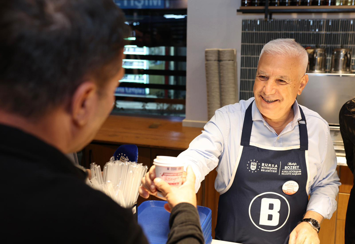 Eşi Seden Bozbey ile birlikte barista önlüklerini giyen Başkan Bozbey, Cumhuriyetin 102. yılına özel olarak hazırlanan ‘Cumhuriyet Demek’ temalı bardaklarda içecek ikramında bulundu. Vatandaşların isimlerini ‘Cumhuriyet demek' temalı bardaklara yazan Başkan Mustafa Bozbey ve eşi Seden Bozbey, Atatürk’ün emanet ettiği Cumhuriyet’in sıcaklığını Bursalılarla birlikte paylaştı. Bu sene kutlamaların teması olan ‘Cumhuriyet demek, hepimiz demek’ sloganını da yazarak ikramda bulunan Başkan Bozbey ve eşi Seden Bozbey, kahve keyfini vatandaşlarla birlikte yaşadı.