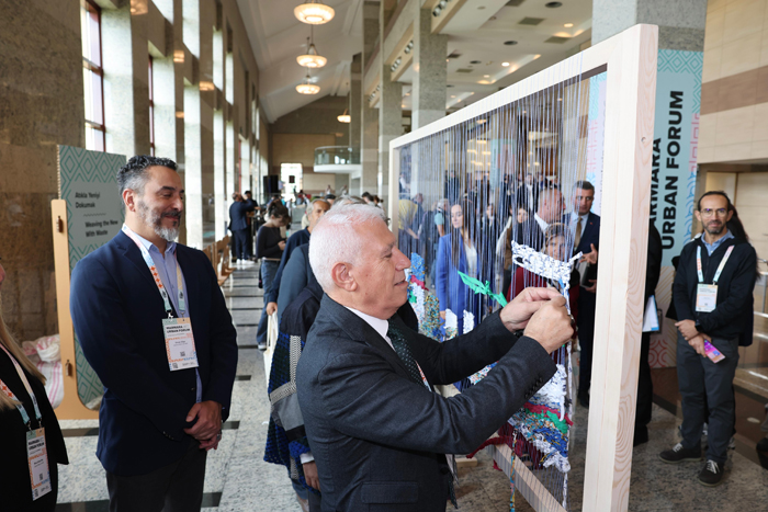 Marmara Urban Forum kapsamında kurulan atölyelerde, atık kumaşların yeniden hayat bulduğu dokuma çalışmalarına da katılan Başkan Mustafa Bozbey, kendi elleriyle kumaşları dokuyarak atölyeye katkı sundu. Yapılan dokumanın geri dönüşümün ve sürdürülebilir yaşamın sembolü olduğunu ifade eden Başkan Bozbey, “Her atık, doğru yöntemlerle değerlendirildiğinde geleceğe umut oluyor. Daha temiz, daha yeşil ve daha yaşanabilir kentler için geri dönüşümü hayatın her alanına yaymak hepimizin sorumluluğu” diye konuştu.