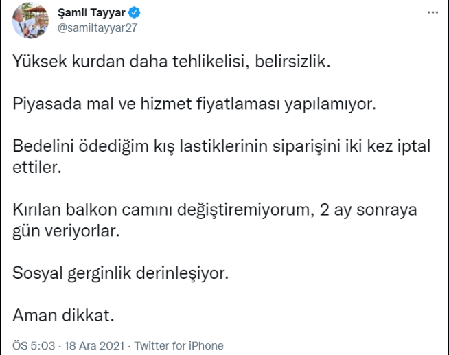 AK Parti MKYK Üyesi Şamil Tayyar, artan dolar kuru karşısında uyarıda bulunarak, “Yüksek kurdan daha tehlikelisi, belirsizlik. Piyasada mal ve hizmet fiyatlaması yapılamıyor. Sosyal gerginlik derinleşiyor. Aman dikkat.” dedi.