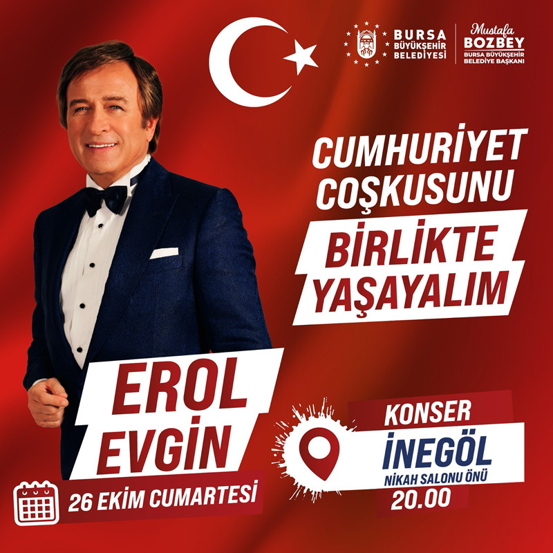 Etkinlikler kapsamında ilk olarak 25 Ekim Cuma günü Bursalı sanatçı Fettah Can, Karacabey ilçesi Cumhuriyet Meydanı’nda sahne alıyor. 26 Ekim Cumartesi günü usta sanatçı Erol Evgin, İnegöl ilçesi nikah salonu önünde Bursalılar için en sevilen şarkılarını seslendirecek. 27 Ekim Pazar günü ise Yıldırım ilçesi eski İhtisas Hastane alanında ünlü sanatçı Haluk Levent rüzgarı esecek. 28 Ekim Pazartesi günü ise Merinos Atatürk Kongre Kültür Merkezi’nde Arpanatolıa-Bursa Bölge Devlet Senfoni Orkestrası konseri ile Gemlik ilçesi İskele Meydanı’nda Ali Altay konseri düzenlenecek.