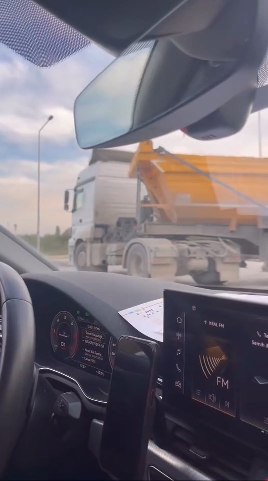 Yol ayrımından girmek için hareket eden otomobil ise, karşısında gördüğü kamyonu görünce neye uğradığını şaşırdı. Ters yönden gelen 16 BBJ 665 plakalı kamyon, herkesin canını hiçe sayması, 10 dakika veya 10 kilometre kaybetmek istememek için 'pes' dedirten hareketi, saniye saniye cep telefonu kamerasına yansıdı.
